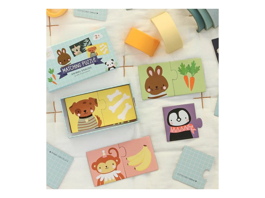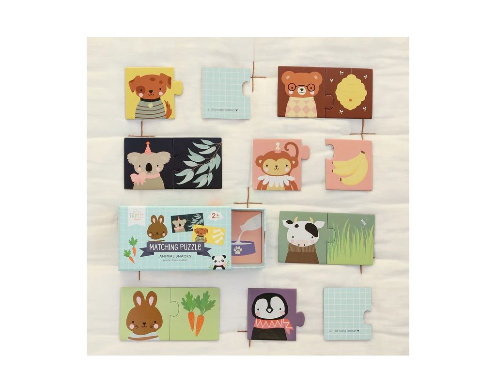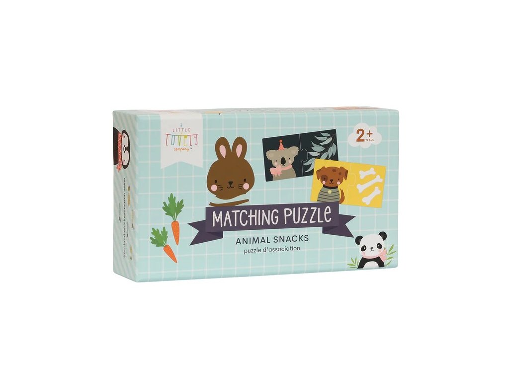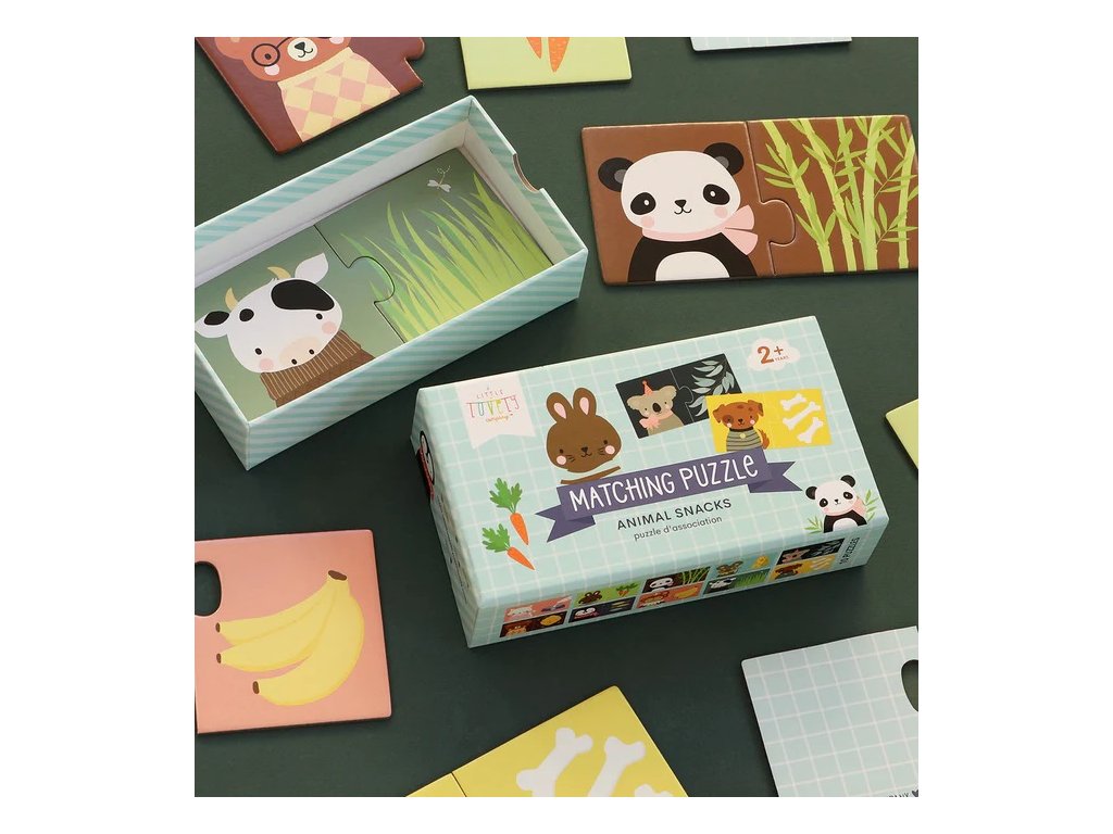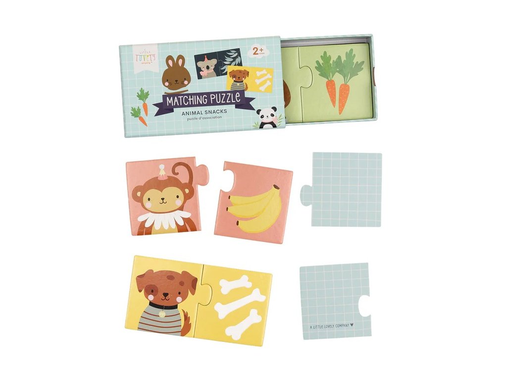 Puzzle na párovanie sa skladá z 10 jednotlivých skladačiek a je vhodné pre deti od 2 rokov. Nájdite svoju oblúbenú pochúťku zvieraťa na obrázku a dokončite sadu. Dieliky puzzle sú vyrobené z pevného kartónu, takže ich malé ruky dobré zvládnu. Puzzle je dodávané v praktickej výsuvnej krabici pre jednoduché uskladnenie.